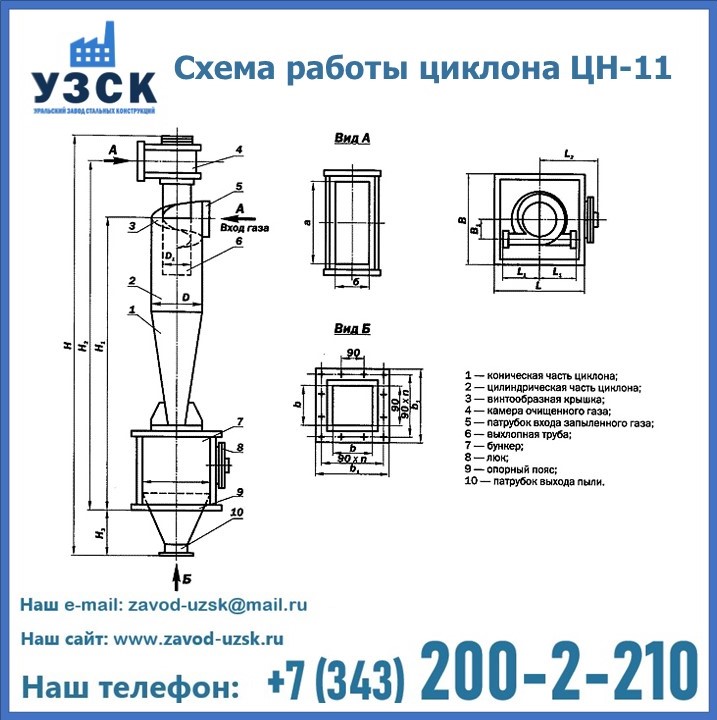 При этом ощутимой разницы в цене между универсальным и узконаправленным, подобранным в соответствии с конкретными техническими требованиями циклоном, нет. Стоимость воздухоочистительного оборудования типа циклон обусловлена маркой и толщиной стали, из которого он изготовлен, сложностью и специфичностью конструкции, наличием дополнительного оснащения (бункер, улитка и другие). При необходимости, на заводе УЗСК в Невинномысске будет изготовлен циклон по индивидуальным техническим чертежам заказчика.
