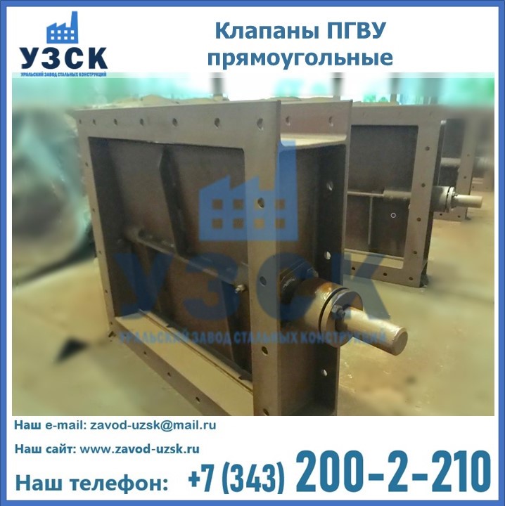 Прямоугольный клапан ПГВУ имеет прямоугольную или квадратную форму, по основному сечению конструкции, на которую устанавливается клапан. Для изготовления шиберов ПГВУ в Невинномысске применяются сталь нержавеющая, углеродистая или низколегированная, в зависимости от модели. Внутри клапана имеется запорный элемент, передвигающийся параллельно общему потоку движения среды. Запорный элемент, или створка имеет такую же форму, как и основное сечение. Перемещение створки происходит благодаря возвратно-поступательным движениям.