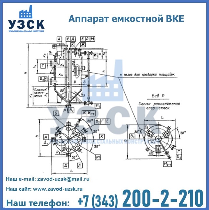 Емкостные аппараты ВКЭ представляют емкость с эллиптической крышей и коническим днищем. аппарат может использоваться в Невинномысске для приема и хранения жидкостей и взрыво- и пожароопасных веществ. Создаваемое давление не должно превышать 0,6; 1,0 МПа. Емкости ВКЭ выполняются как цельносварные. Используется марка стали, отвечающая степени агрессивности продукта и температуре эксплуатации.