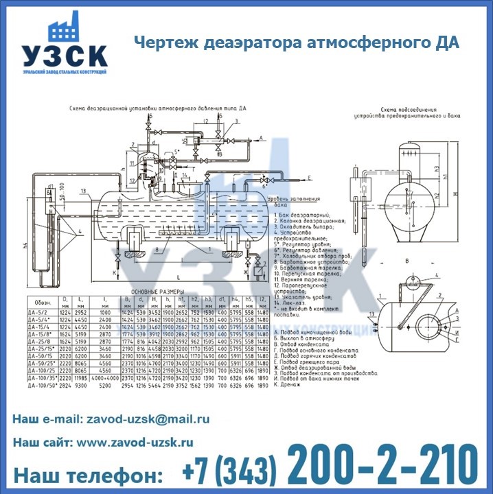 Приобрести качественное оборудование, в том числе, деаэраторы ДА, можно в компании УЗСК в Невинномысске. Мы предлагаем долговечную и надежную продукцию по приемлемой цене. Заказать и купить деаэраторы или другие изделия высокого качества можно через сайт Уральского Завода Стальных Конструкций, или позвонив по указанному в разделе «Контакты» телефону.